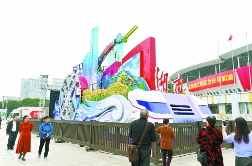 碧波荡漾的“一湖四水”,“精准扶贫”首倡地十八洞村,行业领先的盾构机、吊车臂架,金黄灿烂的超级杂交稻,领跑世界超算速度的“天河二号”……湖南彩车以艺术手法将湖南的人文景观、自然景观和新型工业化发展成果融为一体,流光溢彩、绚丽夺目,十分吸睛。“‘潇湘今朝’,真燃!”大家纷纷在彩车前拍照留念,为湖南彩车精美大气的造型设计点赞,也为湖南取得的辉煌成就感到振奋。