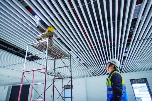 11月27日,长沙汽车南站综合交通枢纽,工人对站房顶棚进行装修。该项目于2015年11月底动工,总建筑面积50.3万平方米,相比之前扩容近10倍。力争年底投入试运营,为市民提供大巴、公交、城际铁路、地铁等出行服务。