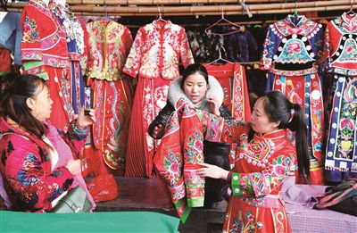 1月10日,在凤凰县禾库镇的集市上,苗族妇女在试穿新式苗族服装。春节将至,该镇的苗族同胞纷纷到集市上购买传统的苗族服装。在湘西地区,苗族妇女们每到传统节日,都喜欢穿上苗族盛装欢度节日。记者 郭立亮 摄