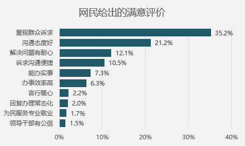 网民普遍评价认为,各地重视群众诉求,工作人员沟通态度好,解决问题有耐心,网上留言与诉求沟通渠道便捷。其中,“重视群众诉求”是出现频次最高的评价,占比35.2%(见下图)。一位安徽阜阳的网友提出了住宅房产证和光纤问题之后,国土资源局和经信委在回复中仔细说明了问题的来龙去脉、相关文件和解决措施。这位网友评价说:我没想到会得到这么详细的回复,感谢政府为群众办实事!”