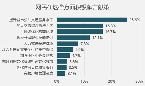 从内容上看,网民主要提出了提升城市公共交通服务水平,加大交通综合执法力度,持续优化营商环境,积极开展职业技能培训等方面的建议(见下图)。