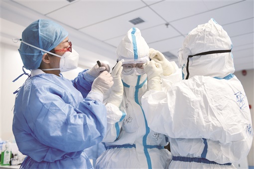 3月1日,湖南医疗队重症医学科护士长徐芙蓉(左)为队员检查护目镜。湖南日报·华声在线记者 辜鹏博 邹晨莹 摄影报道
