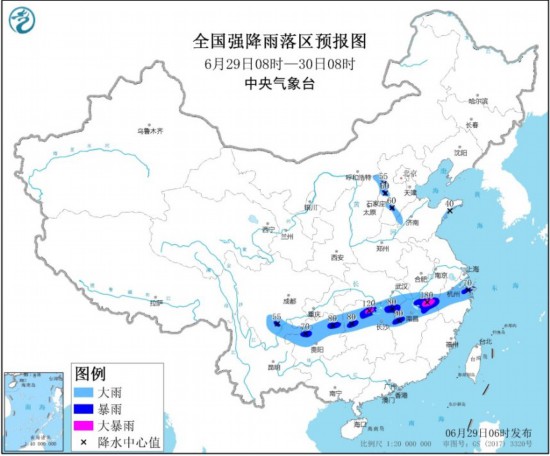 中央气象台6月29日06时发布暴雨蓝色预警: