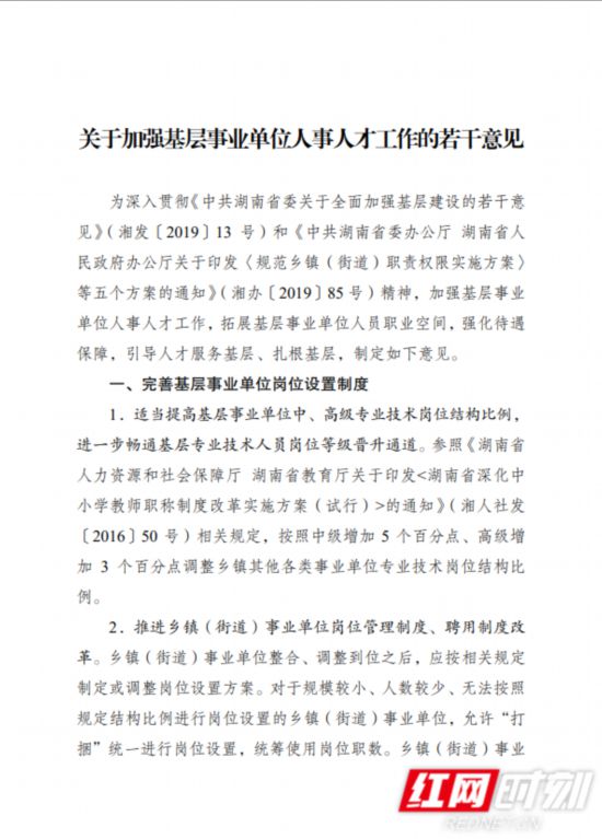 近日,湖南省人力资源和社会保障厅印发《关于加强基层事业单位人事人才工作的若干意见》(以下简称《意见》),从落实基层事业单位人员工资福利待遇、完善激励机制等六大方面制定18条意见,加强基层事业单位人事人才工作,拓展基层事业单位人员职业空间,强化待遇保障,引导人才服务基层、扎根基层。《意见》自2020年8月1日起施行,有效期5年。