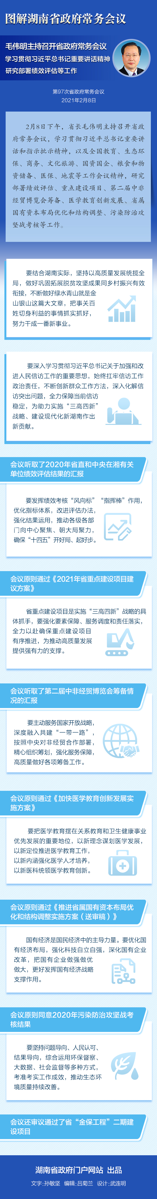 2月8日下午,省长毛伟明主持召开省政府常务会议,学习贯彻习近平总书记重要讲话和指示批示精神,以及全国教育、生态环保、商务、文化旅游、国资国企、粮食和物资储备、医保、地震等工作会议精神,研究部署绩效评估、重点建设项目、第二届中非经贸博览会筹备、医学教育创新发展、省属国有资本布局优化和结构调整、污染防治攻坚战考核等工作。