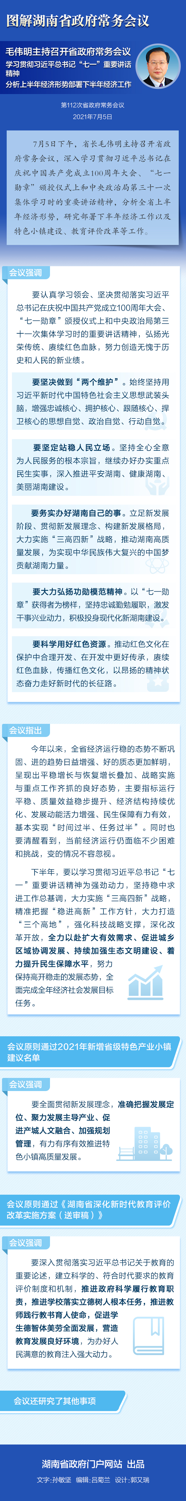 7月5日下午,省长毛伟明主持召开省政府常务会议,深入学习贯彻习近平总书记在庆祝中国共产党成立100周年大会、“七一勋章”颁授仪式上和中央政治局第三十一次集体学习时的重要讲话精神,分析全省上半年经济形势,研究部署下半年经济工作以及特色小镇建设、教育评价改革等工作。