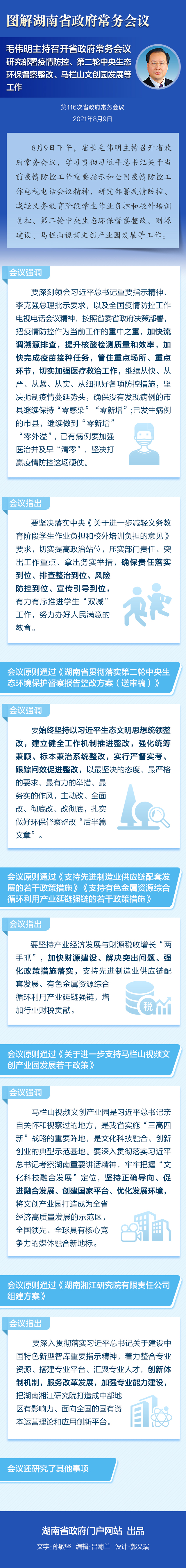 8月9日下午,省长毛伟明主持召开省政府常务会议,学习贯彻习近平总书记关于当前疫情防控工作重要指示和全国疫情防控工作电视电话会议精神,研究部署疫情防控、减轻义务教育阶段学生作业负担和校外培训负担、第二轮中央生态环保督察整改、财源建设、马栏山视频文创产业园发展等工作。