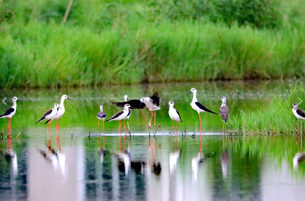 黑翅长脚鹬在湖南炎陵县鹿原镇塘旺村的水塘觅食栖息。刘伟文摄