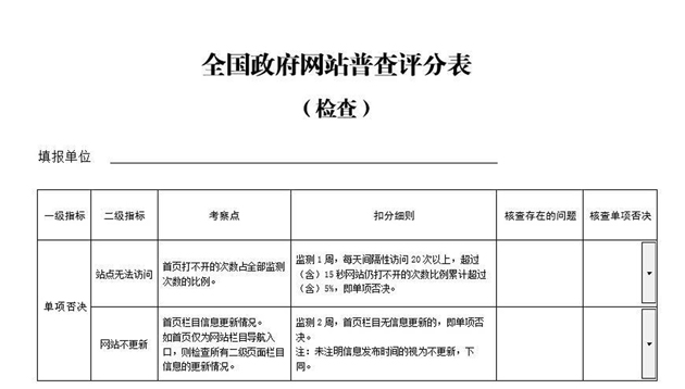 (二)普查内容。按照《全国政府网站普查评分表》检查各政府网站的可用性、信息更新情况、互动回应情况和服务实用情况等。
