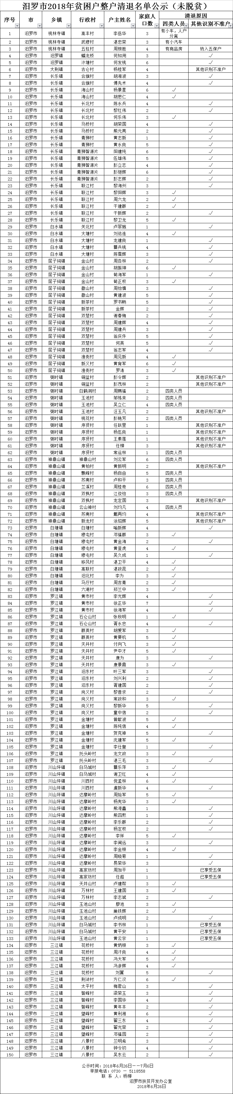 汨罗市2018年贫困户整户清退名单公示(未脱贫)