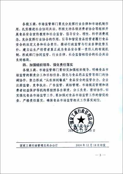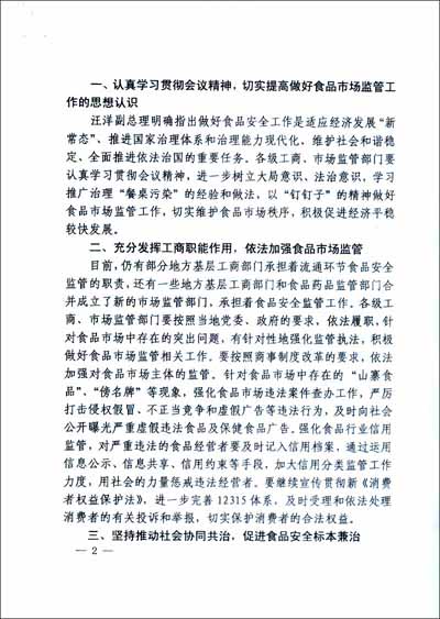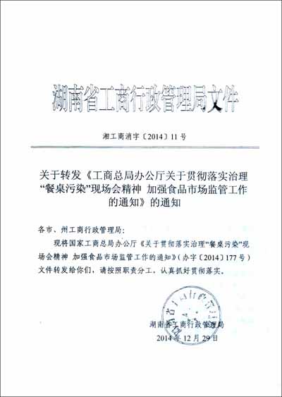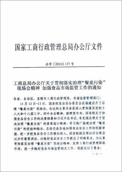 工商总局办公厅关于贯彻落实治理“餐桌污染”现场会精神 加强食品市场监管工作的通知