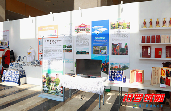 汨罗市文化旅游展板,推介了汨罗江畔端午习俗、闵家新村、普德文化园等知名文化旅游景点,以及屈原酒等知名产品。