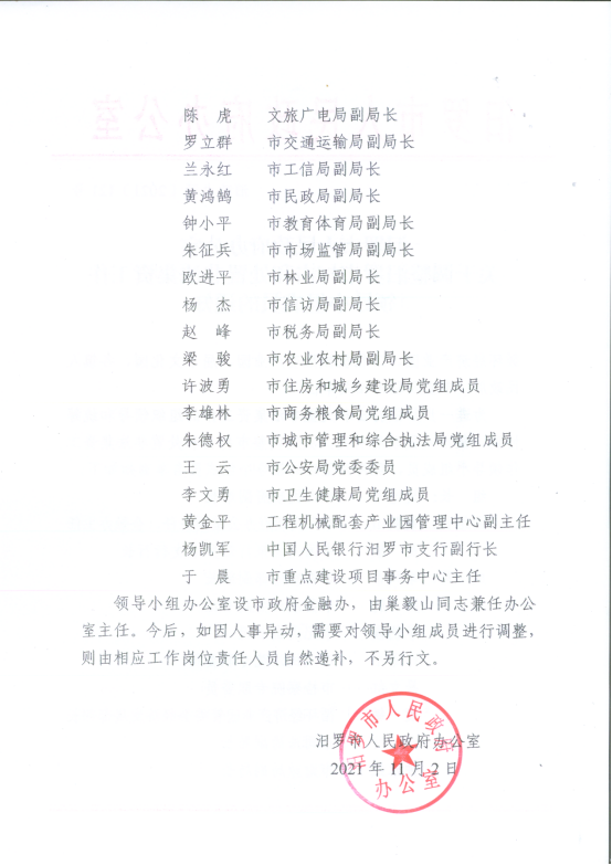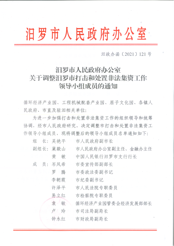 关于调整汨罗市打击和处置非法集资工作领导小组成员的通知