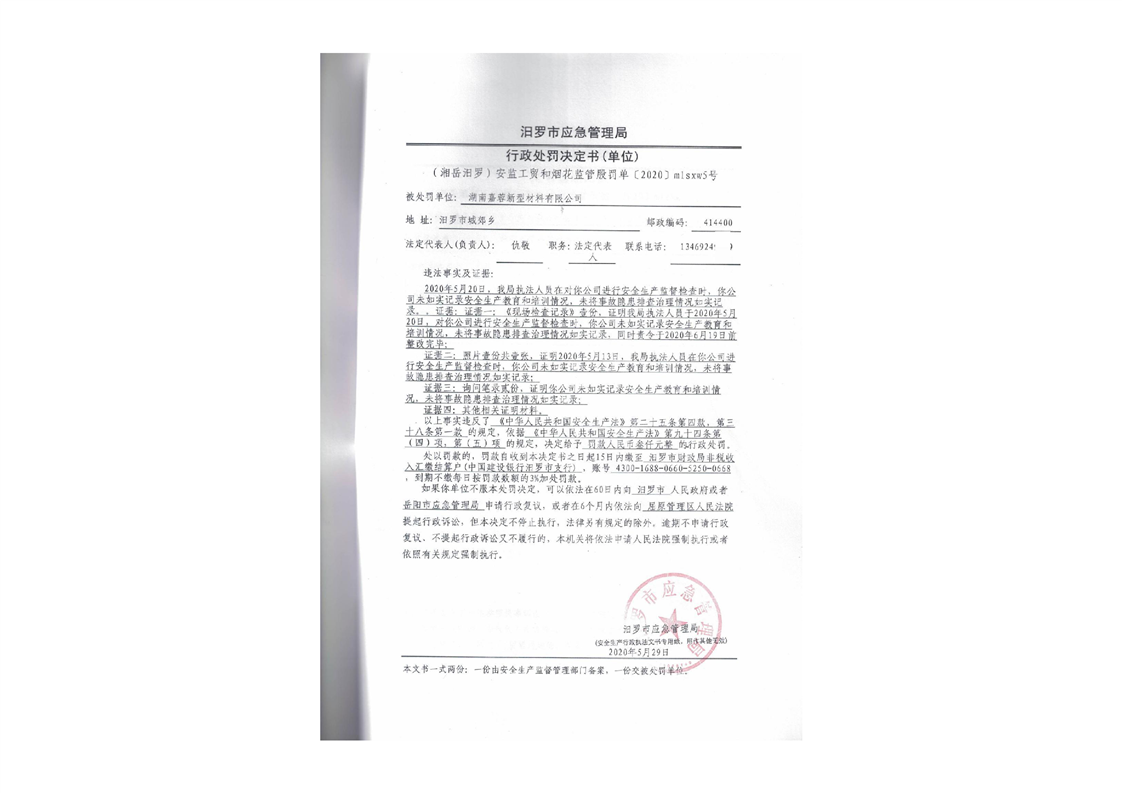 湖南嘉蓉新型材料有限公司行政处罚决定书