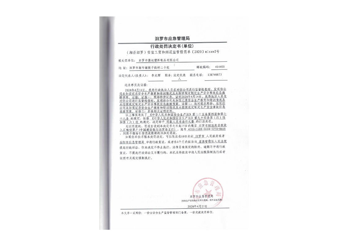 汨罗市腾旭塑料制品有限公司行政处罚决定书