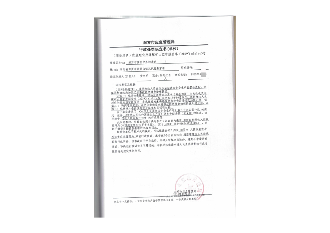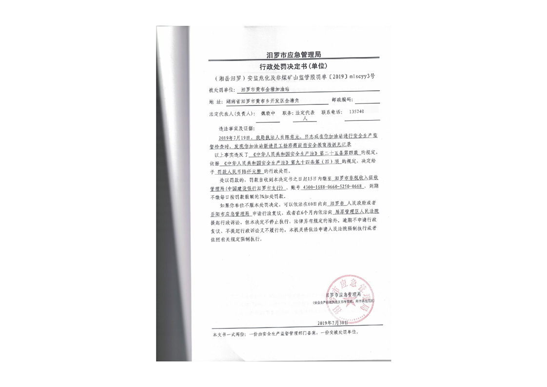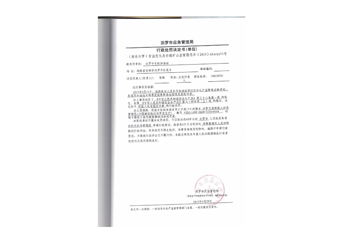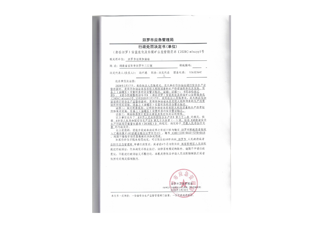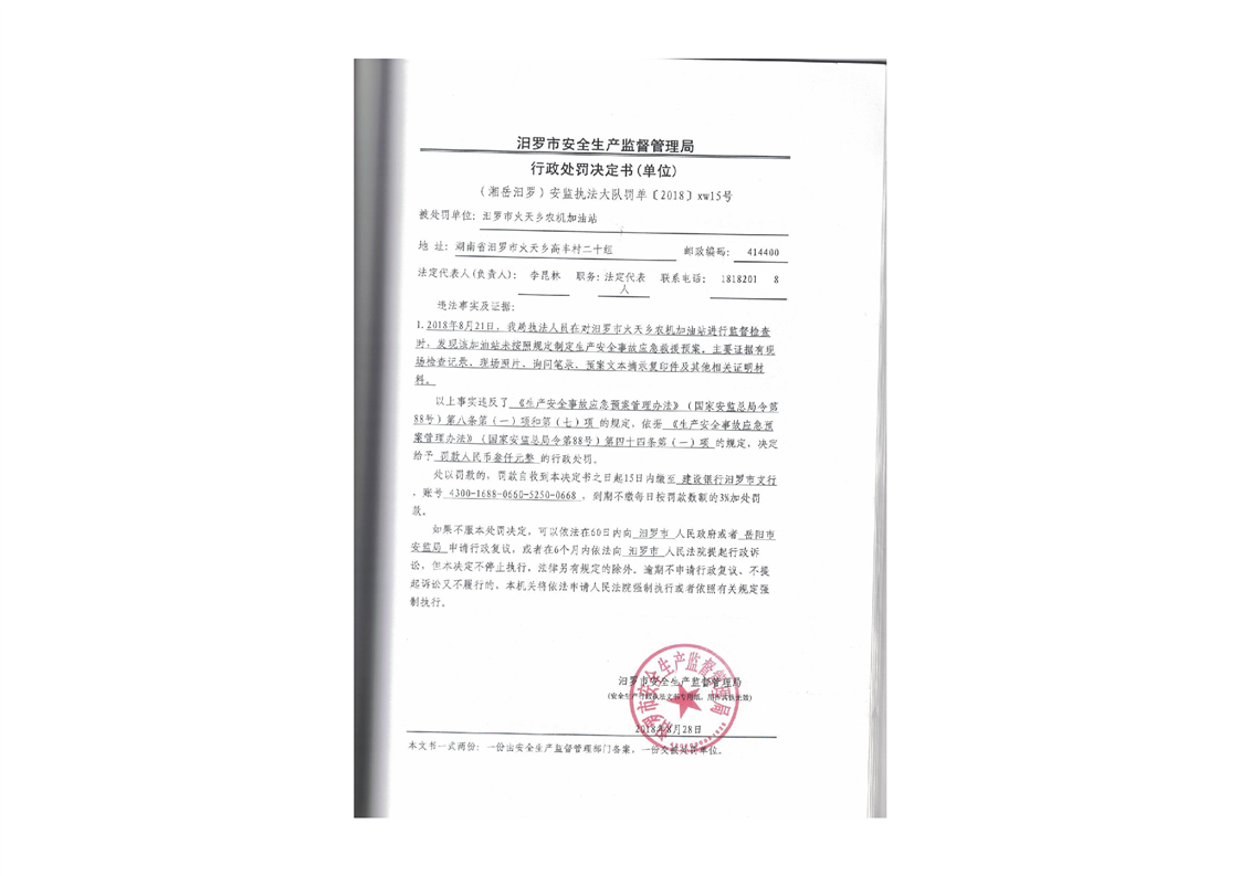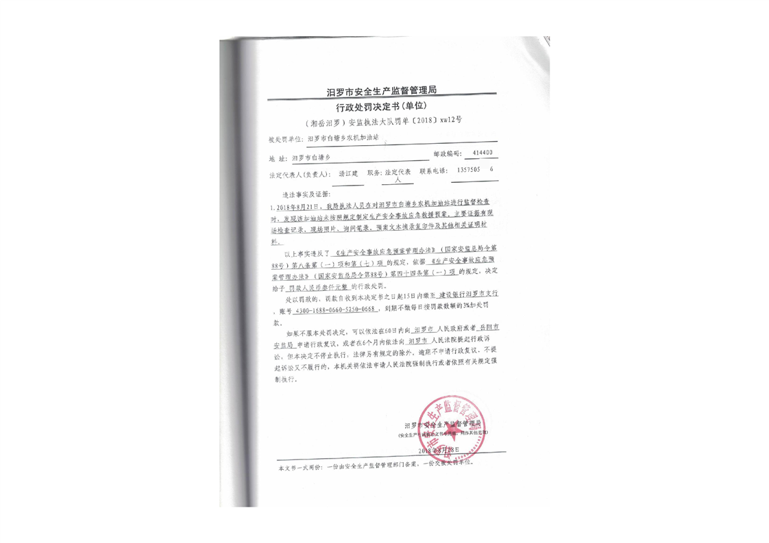汨罗市天井农机加油站行政处罚决定书