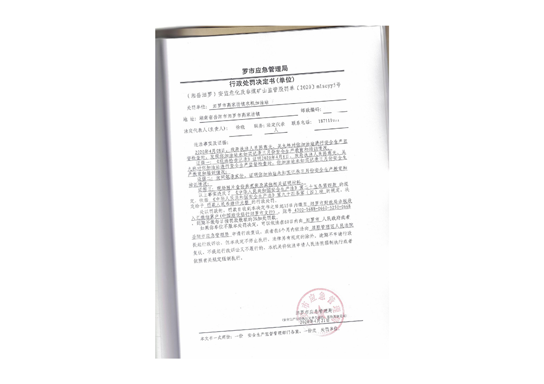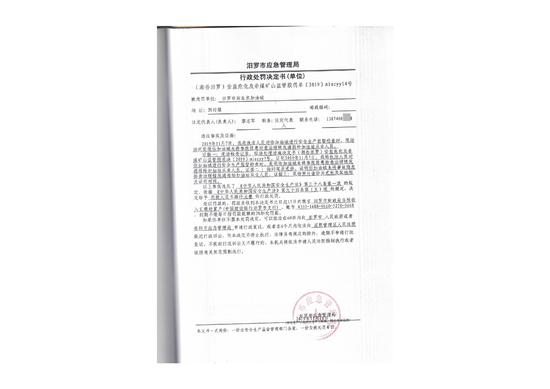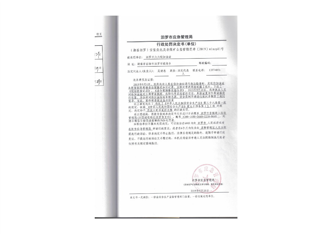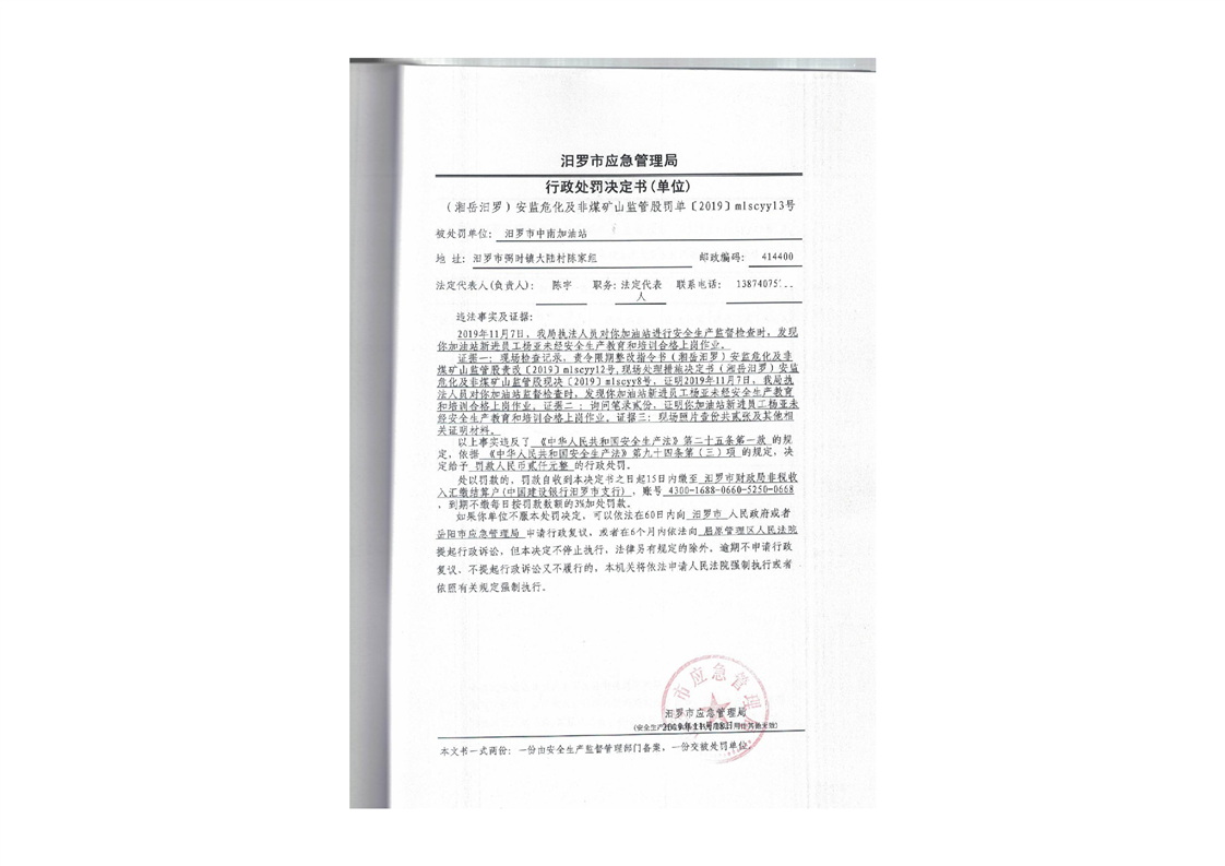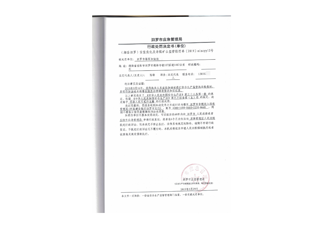 汨罗市天井农机加油站行政处罚决定书