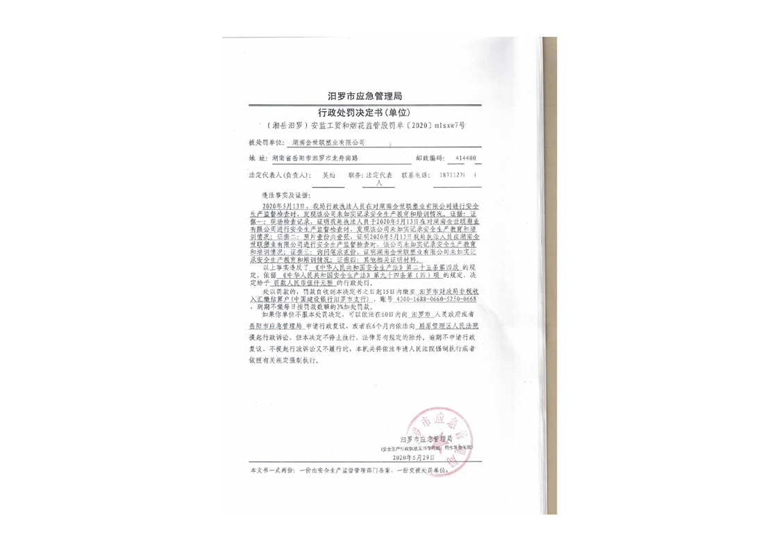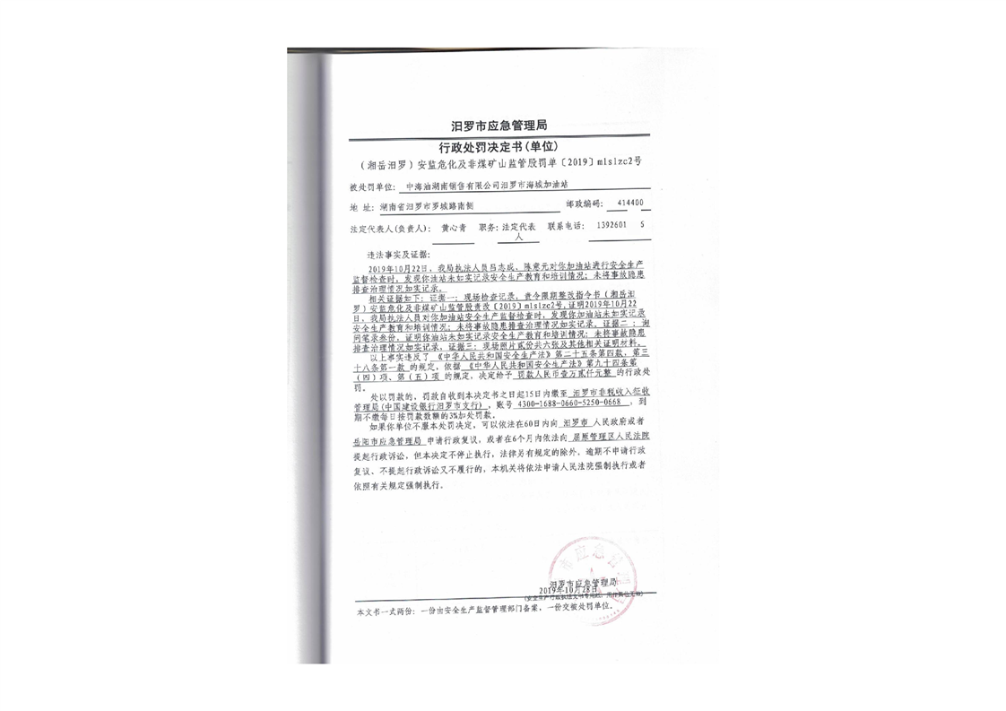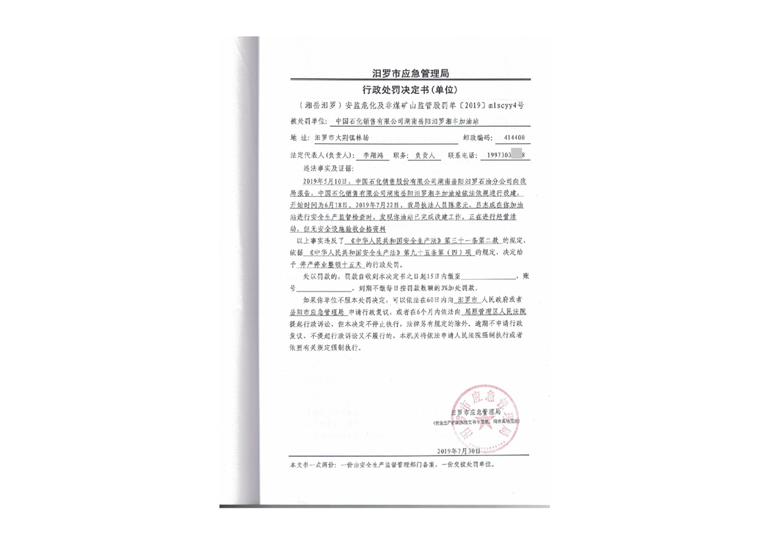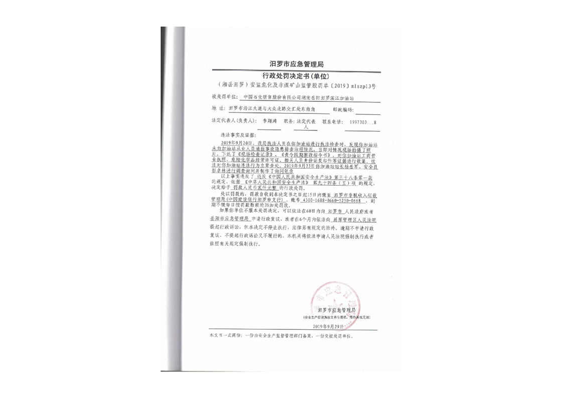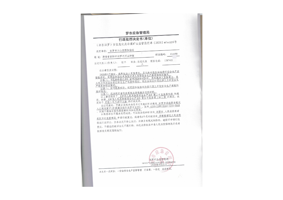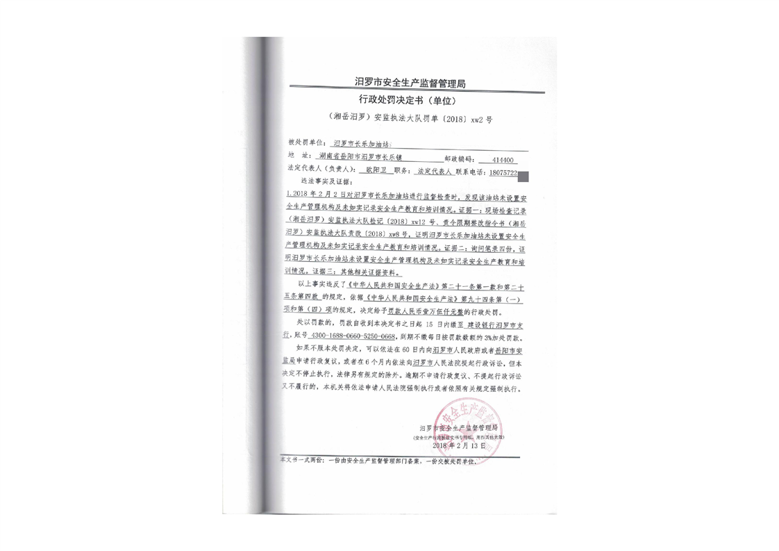 汨罗市天井农机加油站行政处罚决定书