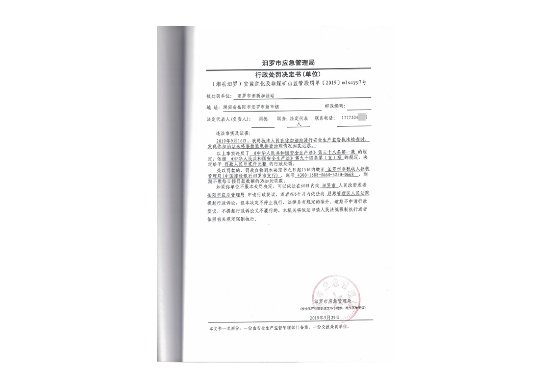 汨罗市汨新加油站行政处罚决定书 (2)