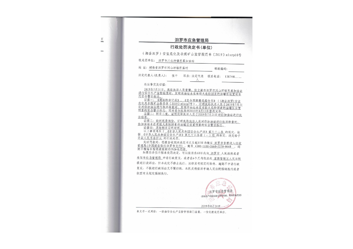 汨罗市川山坪镇芭蕉加油站行政处罚决定书
