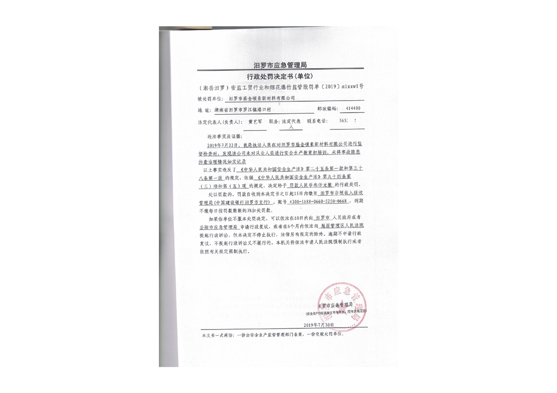 汨罗市盛金碳素新材料有限公司行政处罚决定书