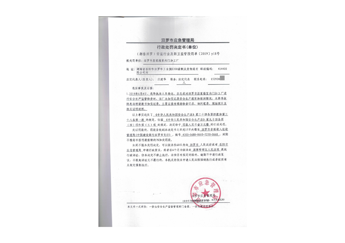 汨罗市居家缘室内门加工厂行政处罚决定书