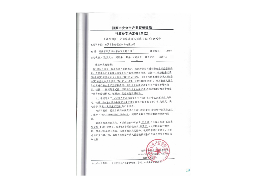 汨罗市智远碳素制品有限公司行政处罚决定书