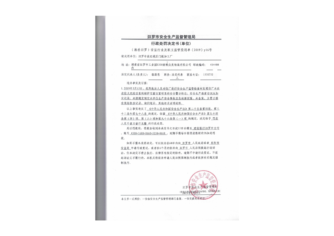 汨罗市美旺模压门板加工厂行政处罚决定书