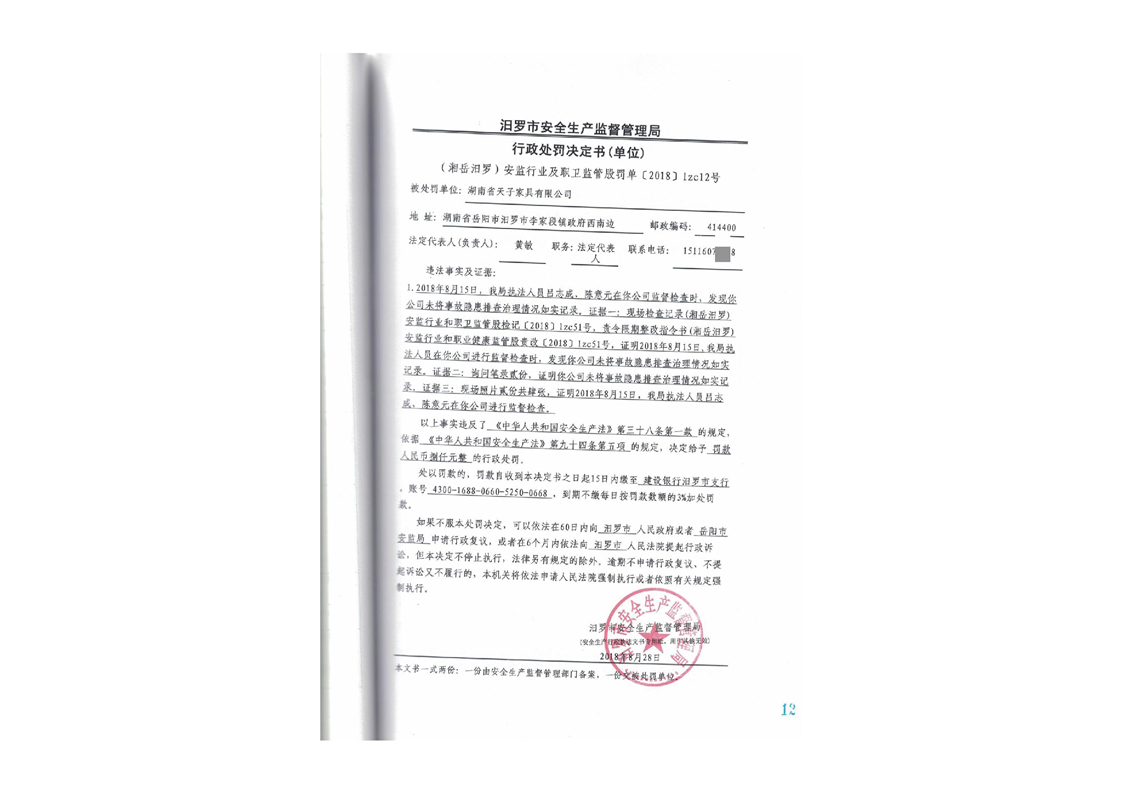 湖南省天子家具有限公司行政处罚决定书