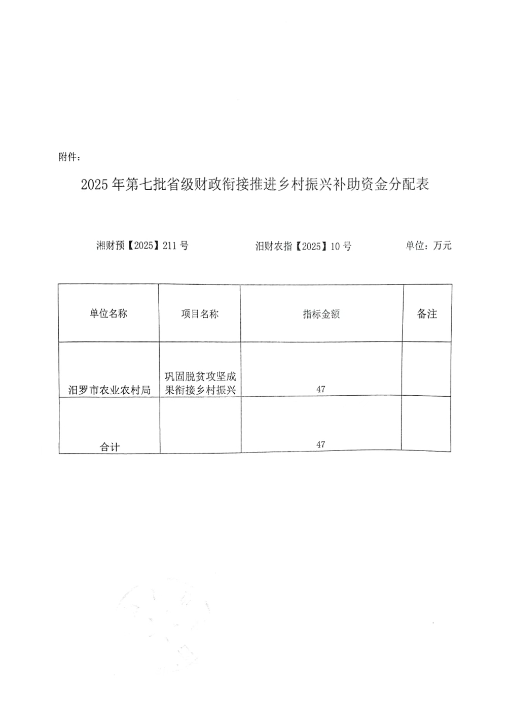 关于下达2025年第七批省级财政衔接推进乡村振兴补助资金的通知