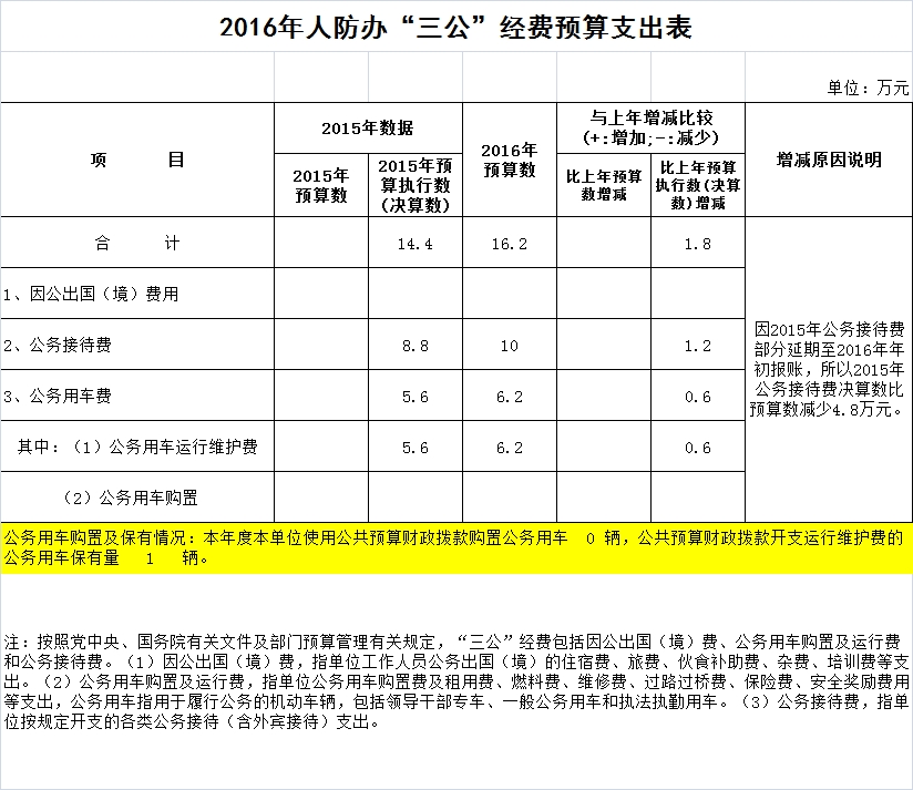 2016年人防办“三公”经费预算支出表