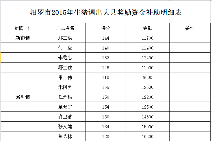 汨罗市2015年生猪调出大县奖励资金补助明细表