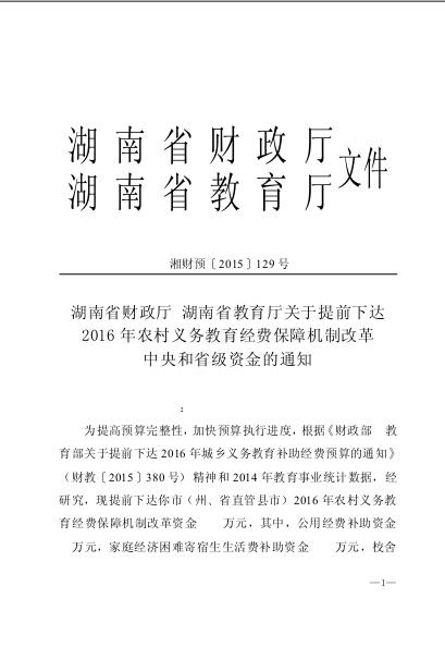 湘财预〔2015〕129号保障机制改革中央和省级资金的通知