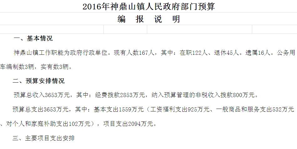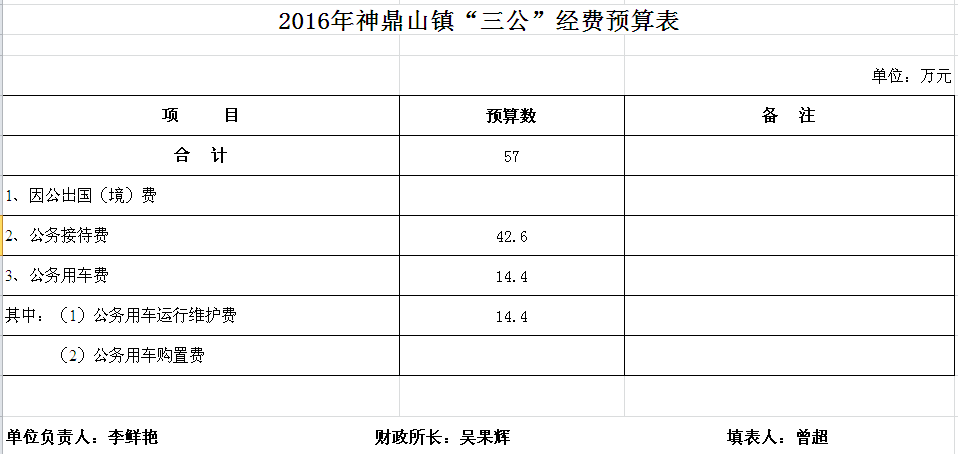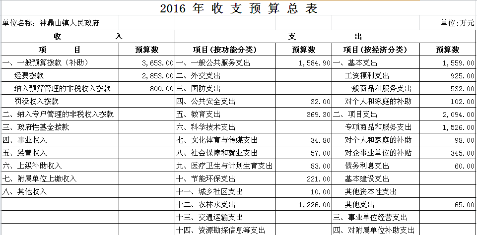 2016年神鼎山镇收支预算总表及“三公”经费预算表
