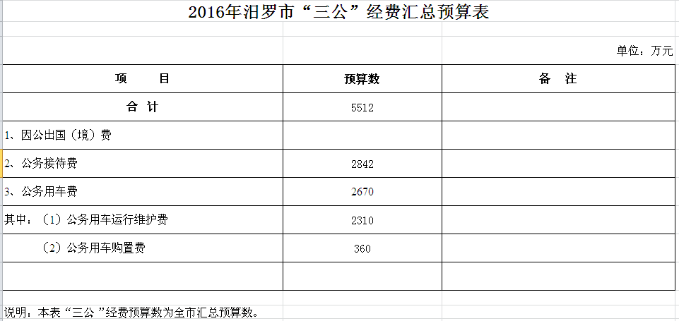 2016年汨罗市“三公”经费汇总预算表