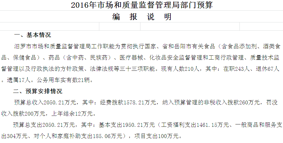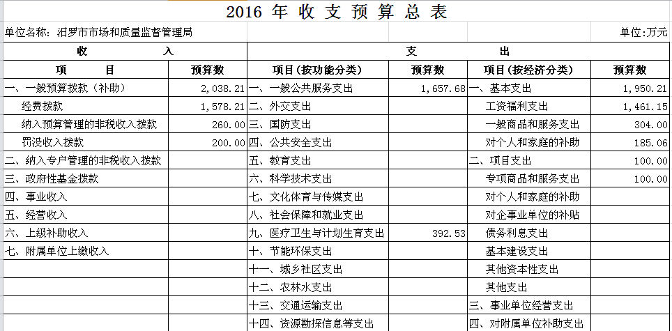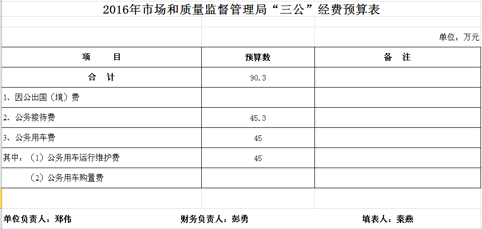 2016年市场和质量监督管理局收支预算总表及“三公”经费预算表