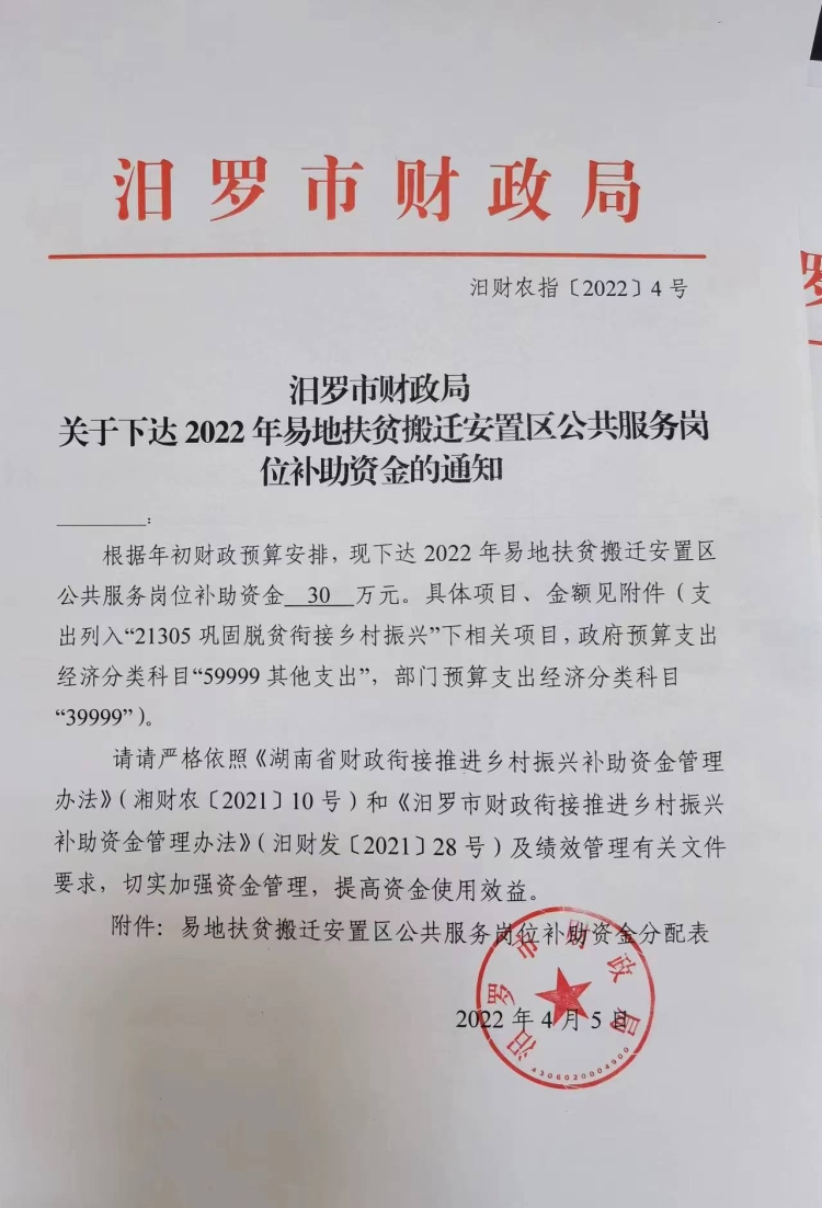 汨罗市财政局关于下达2022年易地扶贫搬迁安置区公共服务岗位补助资金的通知