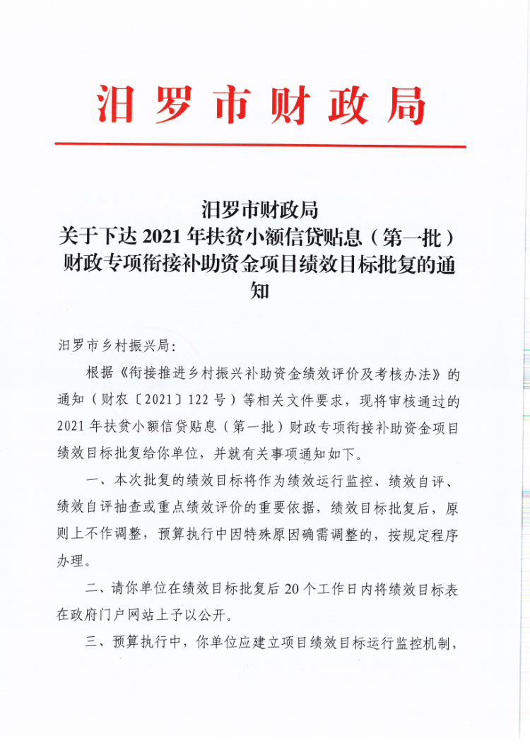 汨罗市财政局关于下达2021年扶贫小额信贷贴息(第一批)财政专项扶贫资金项目绩效目标批复的通知