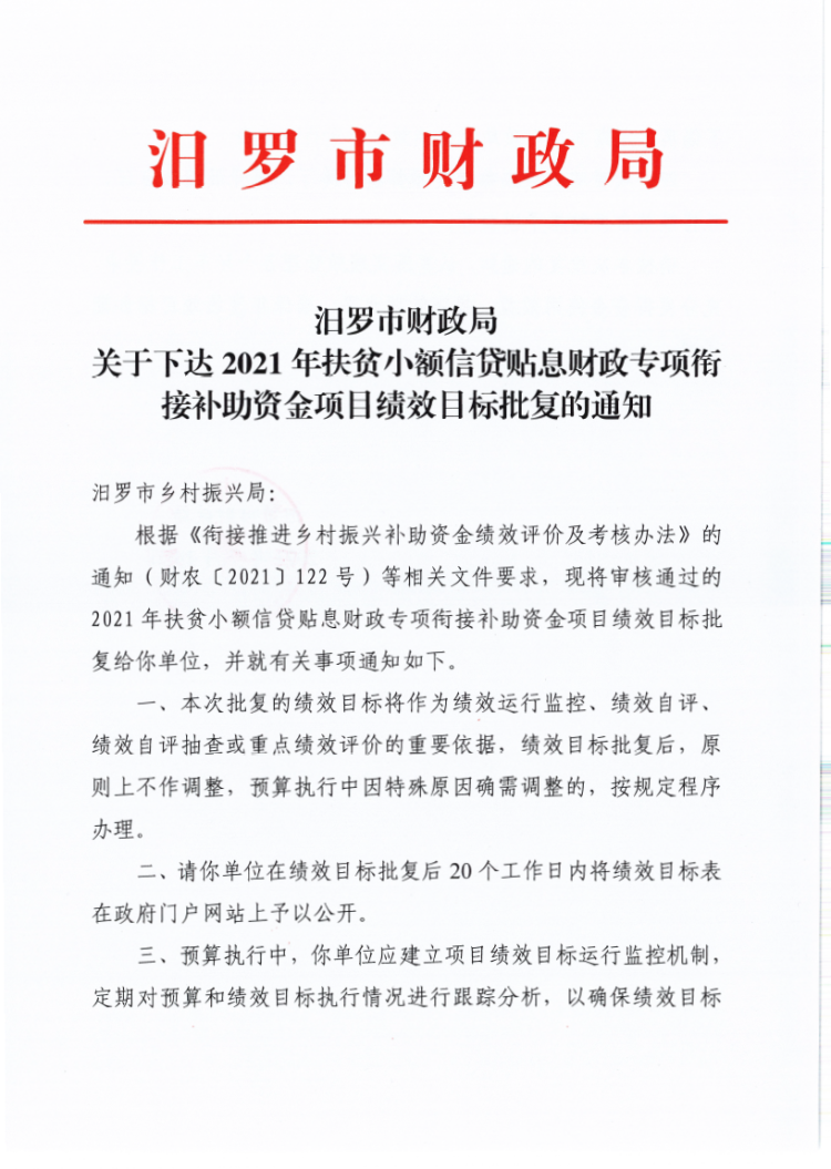 汨罗市财政局关于下达2021年扶贫小额信贷贴息财政专项衔接补助资金项目绩效目标批复的通知