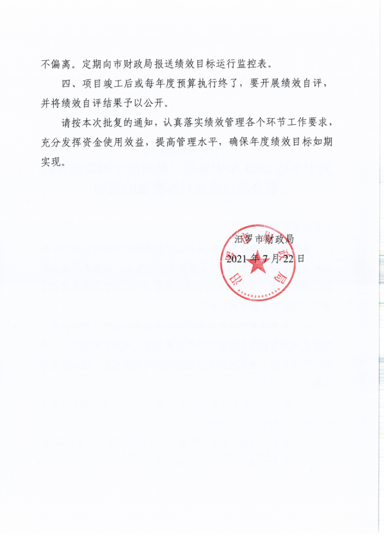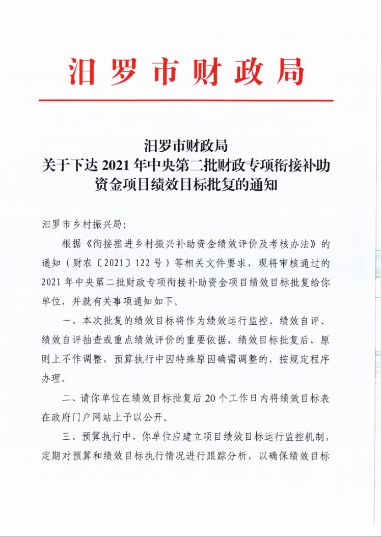 汨罗市财政局关于下达2021年中央第二批财政专项衔接补助资金项目绩效目标批复的通知
