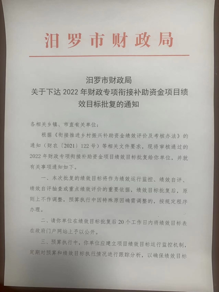 汨罗市财政局关于下达2022年财政专项衔接补助资金项目绩效目标批复的通知