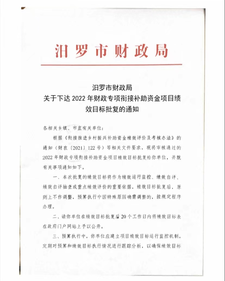汨罗市财政局 关于下达2022年财政专项衔接补助资金项目绩效目标批复的通知