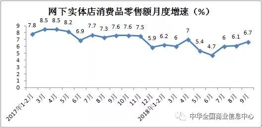前三季度实体店零售额累计增长6.1%,增速较1-8月份提升0.1个百分点。其中,9月份同比增长6.7%,增速较上月加快0.6个百分点,增速自7月份开始连续快于上月。