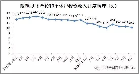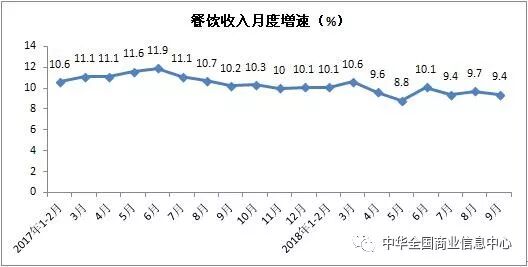 前三季度,餐饮收入实现29763亿元,累计增长9.8%,增速与1-8月份持平。其中,9月份餐饮收入同比增长9.4%,增速较上月放缓0.3个百分点。