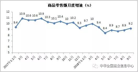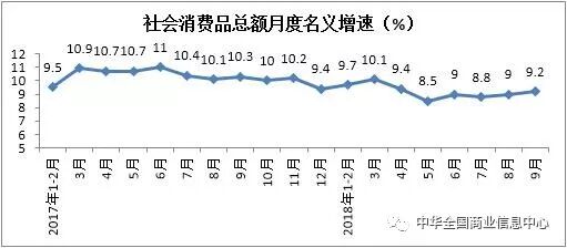 2018年前三季度社会消费品零售总额实现274299亿元,累计增长9.3%,增速与1-8月份持平。其中,9月份社会消费品零售总额实现32005亿元,同比增长9.2%,增速较上月加快0.2个百分点。月度同比增速自8月份连续两个月回升。