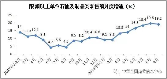 前三季度,限额以上单位石油及制品类零售额同比增长14.4%,增速快于1-8月份0.7个百分点。拉动社会消费品零售总额增长0.72个百分点。其中,9月份同比增长19.2%,增速较上月放缓0.4个百分点。