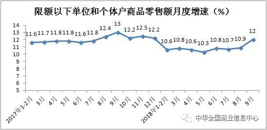 前三季度,限额以下单位和个体户商品零售额实现146437亿元,累计增长10.8%,增速较1-8月份加快0.2个百分点。其中,9月份同比增长12%,增速较上月加快1.1个百分点。前三季度,限额以下单位和个体户商品零售额对商品零售总额增长的贡献率为69.3%,占商品零售总额的比重为59.9%。