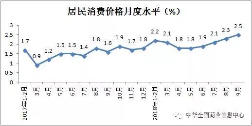 前三季度,居民消费价格累计上涨2.1%,涨幅较2017年同期提高0.6个百分点。其中食品价格同比上涨1.4%,涨幅较2017年同期加快3.1个百分点;非食品价格同比上涨2.2%,涨幅较同期放缓0.1个百分点。消费品价格同比上涨1.8%,涨幅较同期提高1.2个百分点;服务价格同比上涨2.6%,涨幅较上年同期放缓0.3个百分点。