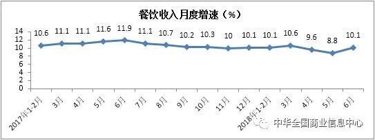 上半年,餐饮收入实现19457亿元,同比增长9.9%,增速较2017年同期放缓1.3个百分点。其中,6月份餐饮收入同比增长10.1%,增速较2017年同期放缓1.8个百分点。