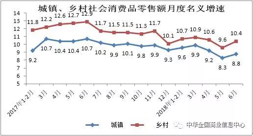 上半年,乡村消费品零售额实现25927亿元,同比增长10.5%,增速比2017年同期放缓1.8个百分点。其中,6月份乡村消费品零售额同比增长10.4%,增速较2017年同期放缓2.5个百分点。